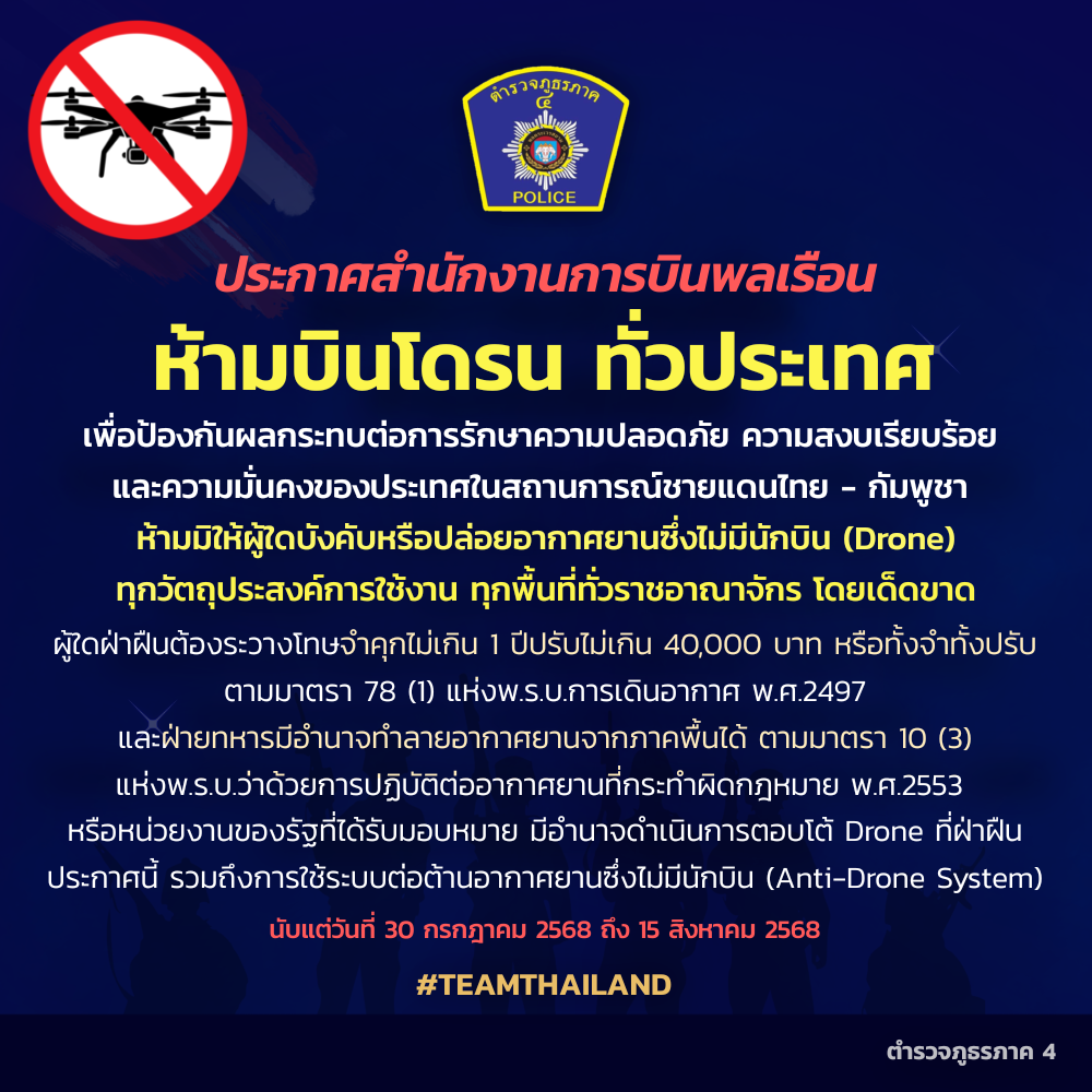สำนักงานการบินพลเรือนแห่งประเทศไทย (กพท.) หรือ CAAT ออกประกาศห้ามบินโดรนทุกประเภท ทั่วประเทศ เพื่อความมั่นคงจากสถานการณ์ชายแดนไทย–กัมพูชา